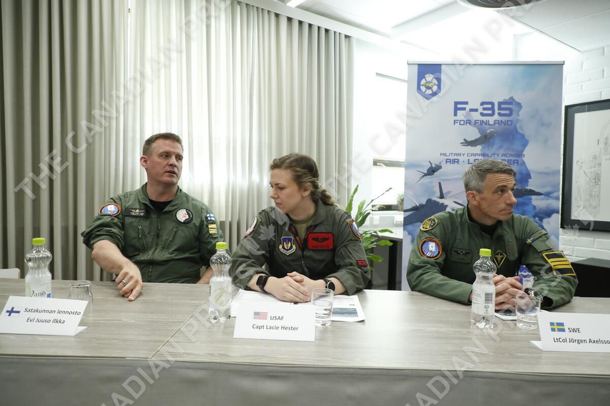 Commanding officer (CO) of the Air Combat Centre Satakunnan lennosto Ilkka Juuso (L), Captain Lacie Hester of US and Swedish Air Force Officer Jörgen Axelsson (R) during Arctic Challenge Exercise 23 live air operations drill in Pirkkala near Tampere, Finland on May 31, 2023. The exercise is hosted by the Air Forces of Finland, Norway and Sweden. Apart from the host nations, the exercise will involve participants from the Netherlands, Belgium, the United Kingdom, Italy, Canada, France, Germany, Switzerland, Denmark, the Czech Republic and the United States, and NATO with its AWACS aircraft. LEHTIKUVA / KALLE PARKKINEN - FINLAND OUT. NO THIRD PARTY SALES.