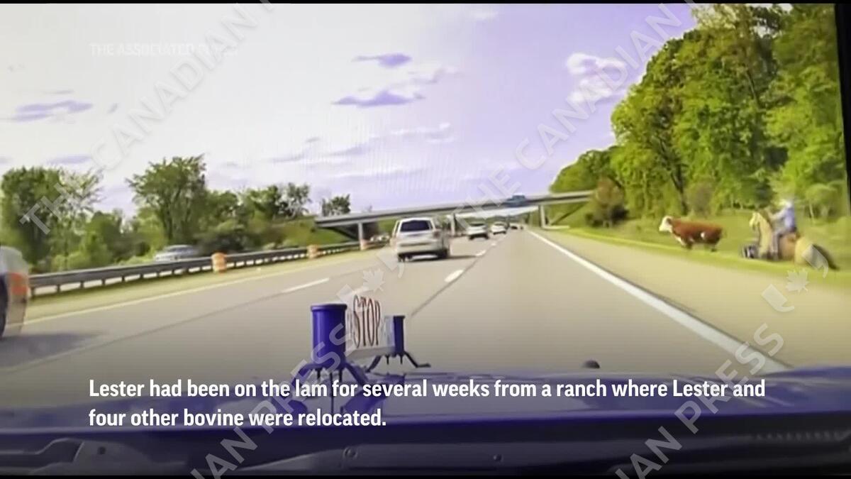 A team of wranglers chased down and captured a wayward steer named Lester across several lanes of a Detroit-area freeway. State police in-car video shows the tail-end of Sunday chase, about 57 miles northwest of Detroit. (May 22)