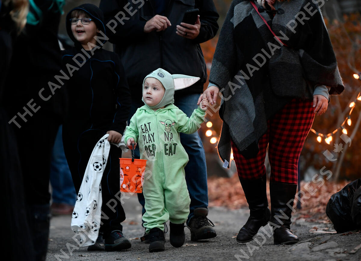 Robert Earl, two-years-old, dressed as baby Yoda, goes trick-or-treating with his family at Rideau Hall on Halloween in Ottawa on Monday, Oct. 31, 2022. THE CANADIAN PRESS/Justin Tang