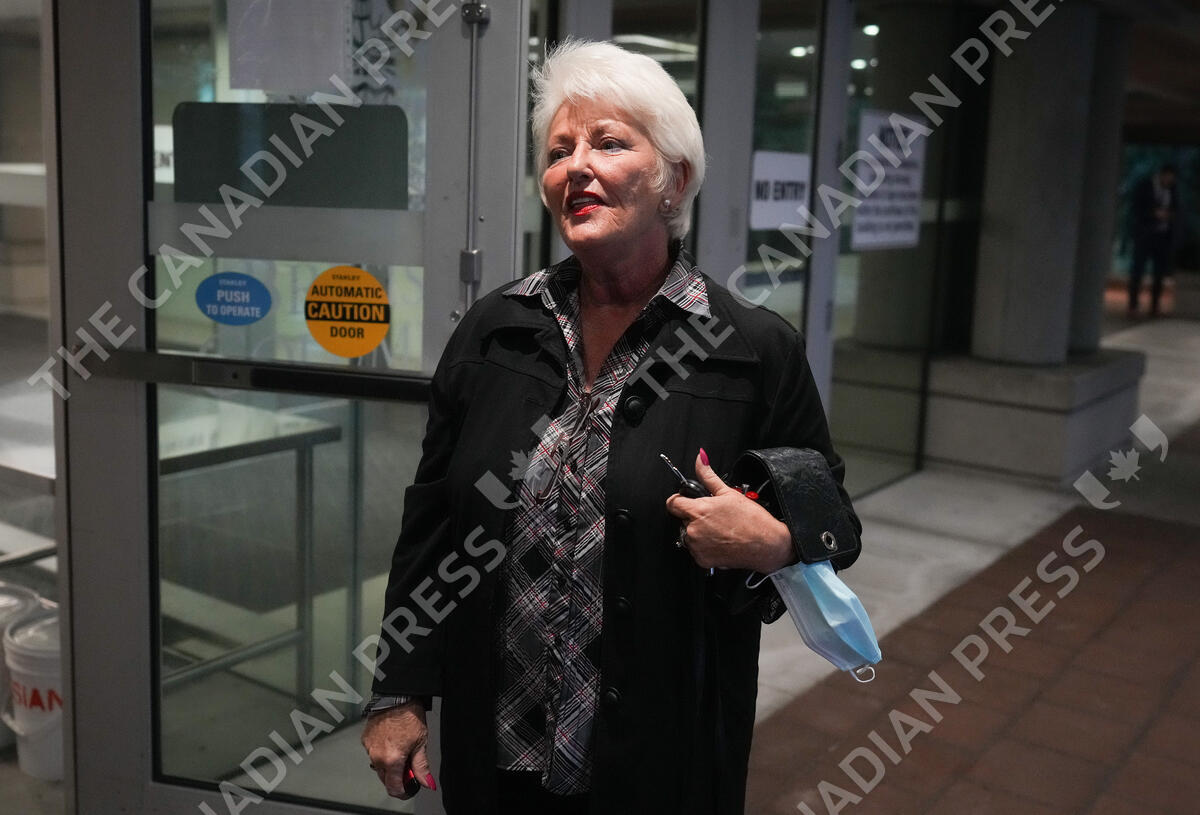 Witness Debi Johnstone arrives at the public mischief trial for outgoing Surrey Mayor Doug McCallum, who was defeated in the recent municipal election, at provincial court, in Surrey, B.C., on Monday, Oct. 31, 2022. McCallum was charged last December after complaining to the RCMP that Johnstone, who was collecting signatures to keep the Mounties in Surrey, ran over his foot outside a grocery store. THE CANADIAN PRESS/Darryl Dyck