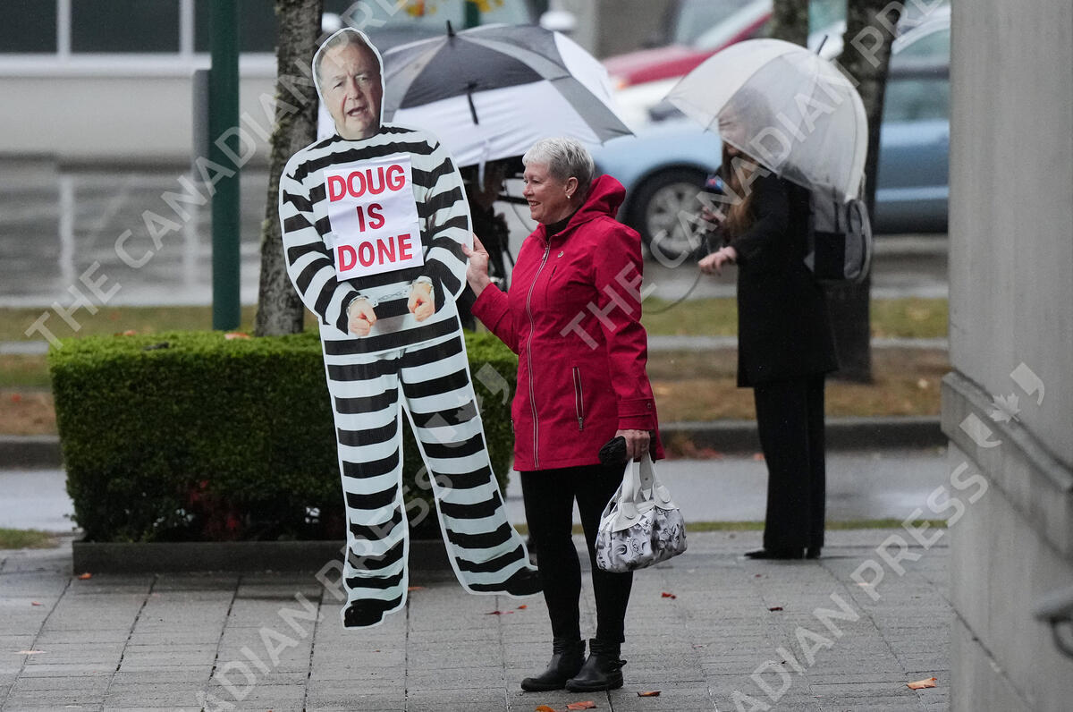 A woman carries a life size cutout of outgoing Surrey Mayor Doug McCallum, who was defeated in the recent municipal election, on the first day of his public mischief trial at provincial court, in Surrey, B.C., on Monday, Oct. 31, 2022. McCallum was charged last December after complaining to the RCMP that a woman collecting signatures to keep the Mounties in Surrey ran over his foot outside a grocery store. THE CANADIAN PRESS/Darryl Dyck