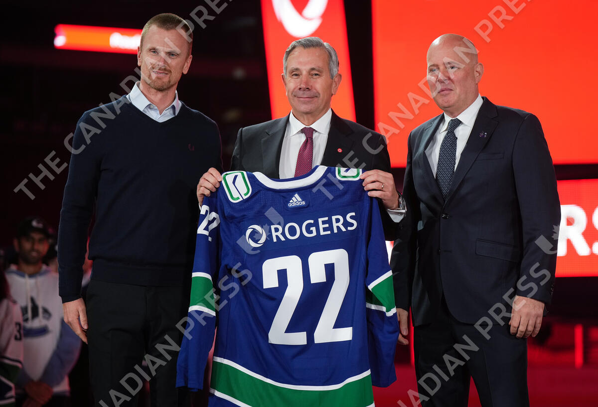 Tony Staffieri, centre, president and CEO of Rogers Communications, poses for photographs with Vancouver Canucks alumni Daniel Sedin, left, and Michael Doyle, president of Canucks Sports & Entertainment, after the Vancouver Canucks NHL hockey team announced an extension of their agreement with Rogers and Sportsnet, in Vancouver, on Monday, October 31, 2022. The renewed partnership includes maintaining the naming rights of the arena and the broadcasting of games on Sportsnet through the 2032-33 season. THE CANADIAN PRESS/Darryl Dyck