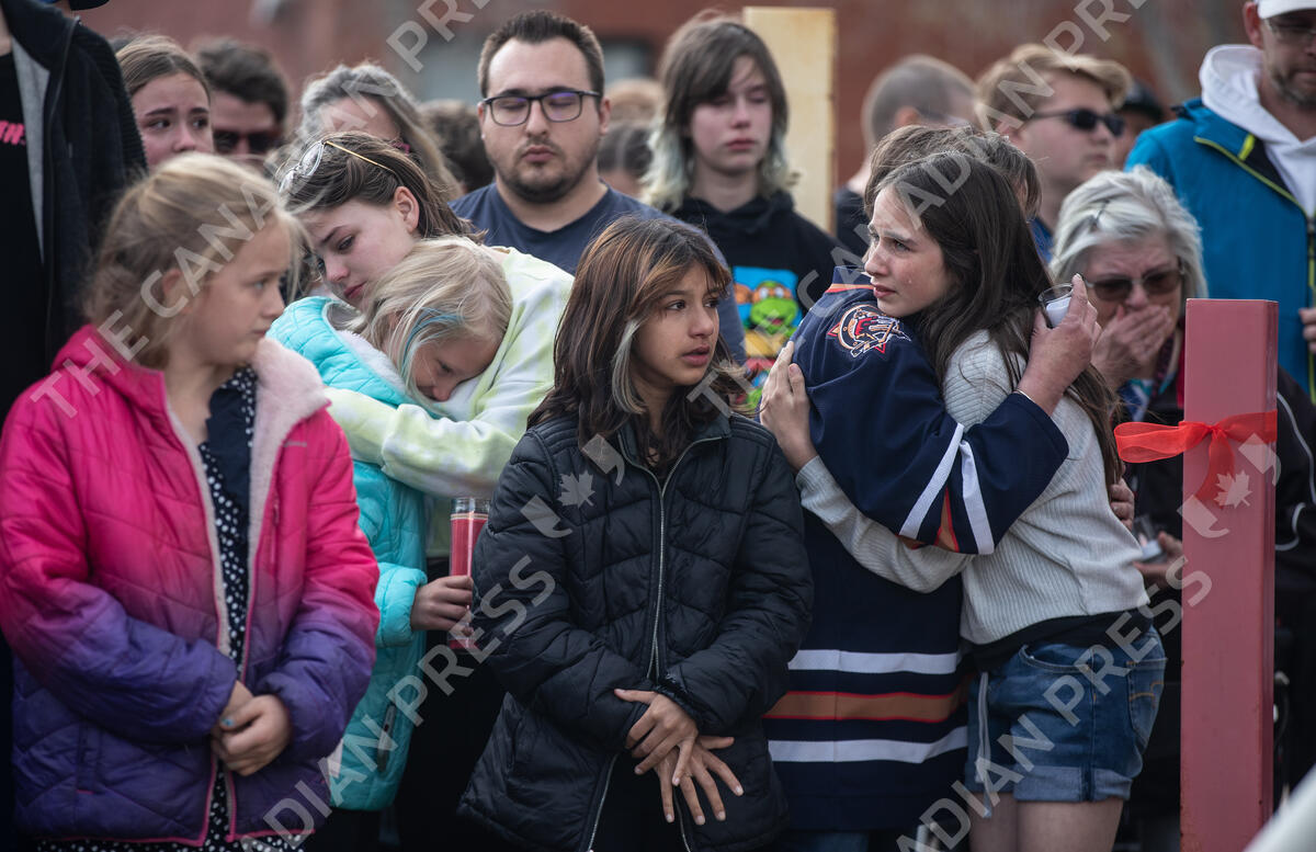 Family and friends console each other at a vigil for a mother and an 11-year-old child who were killed outside a school in Edmonton on Saturday May 6, 2023. THE CANADIAN PRESS/Jason Franson
