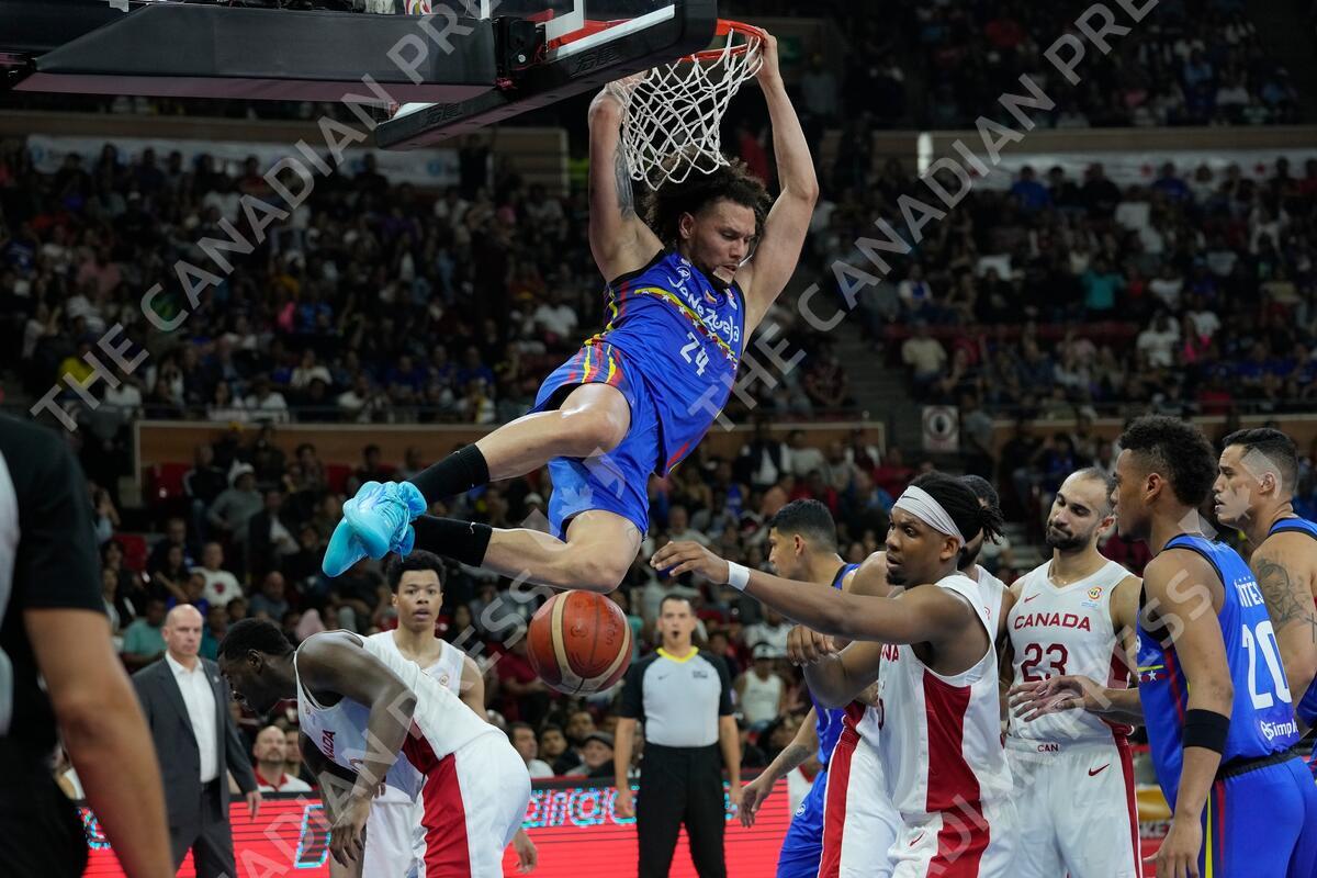 Venezuela's Michael Carrera, dunks agains Canada during a World Cup Americas Basketball qualifier game in Caracas, Venezuela, Sunday, Feb. 26, 2023. (AP Photo/Ariana Cubillos)