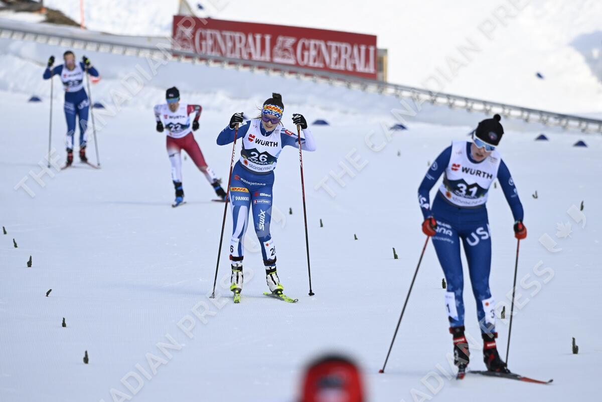 Minja Korhonen of Finland (26) competes during the Individual Gundersen 5km cross-country event of the women's Normal Hill HS102 Nordic Combined competiton at the FIS Nordic Ski World Championships in Planica on February 24, 2023. LEHTIKUVA / VESA MOILANEN - FINLAND OUT. NO THIRD PARTY SALES.