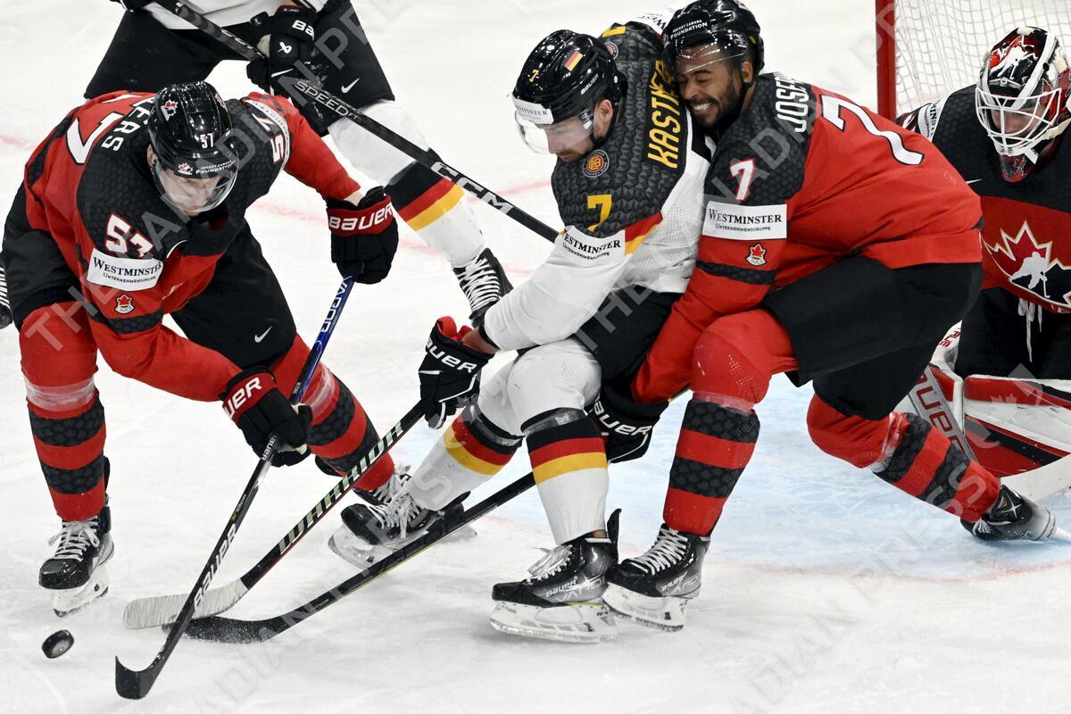 Tyler Myers (57) and Pierre-Olivier Joseph of Canada and Maximilian Kastner of Germany (7) during the 2023 IIHF Ice Hockey World Championships final match between Canada and Germany in Tampere on May 28, 2023. LEHTIKUVA / JUSSI NUKARI - FINLAND OUT. NO THIRD PARTY SALES.