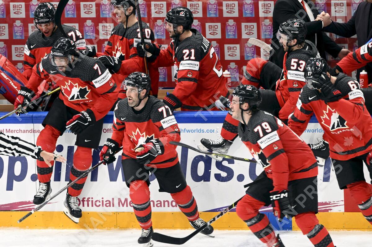 Team of Canada celebrates after winning the 2023 IIHF Ice Hockey World Championships final match between Canada and Germany in Tampere on May 28, 2023. LEHTIKUVA / JUSSI NUKARI - FINLAND OUT. NO THIRD PARTY SALES.