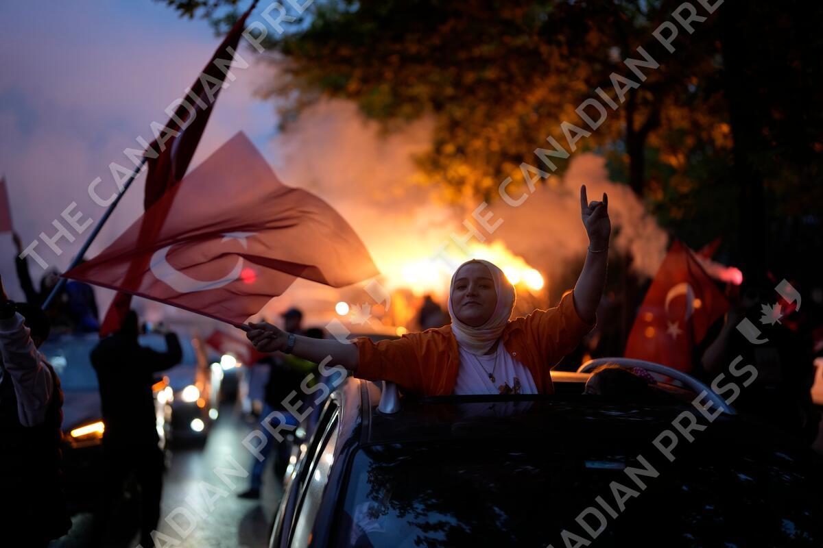 Supporters of the President Recep Tayyip Erdogan celebrate outside AK Party offices in Istanbul, Turkey, Sunday, May 28, 2023. Turkey's incumbent President Recep Tayyip Erdogan has declared victory in his country's runoff election, extending his rule into a third decade. (AP Photo/Khalil Hamra)