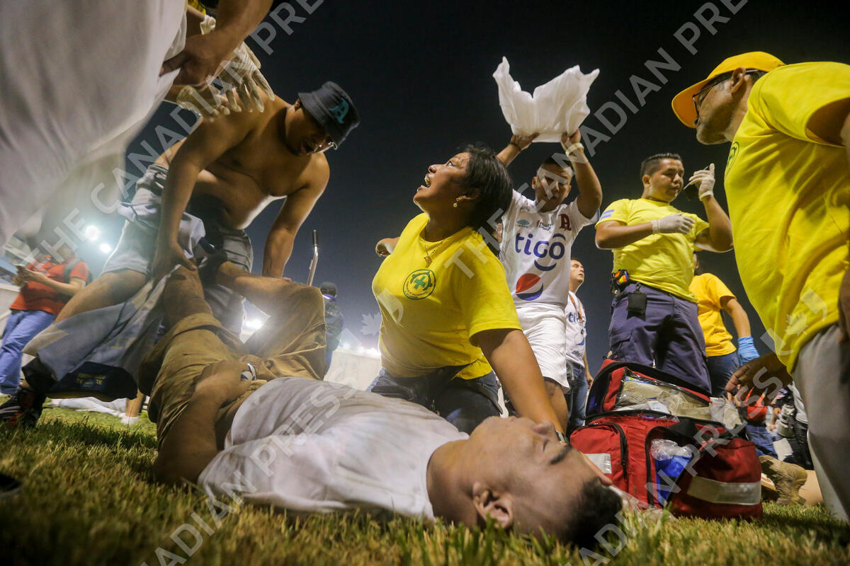 Rescue workers attend to a soccer fan injured when fans pushed down an entrance gate setting off a stampede that left 12 people dead, at the Cuscatlan stadium in San Salvador, El Salvador, Saturday, May 20, 2023. Authorities said hundreds of fans were enraged Saturday night when they weren't allowed to enter the stadium despite having tickets. They pushed until they knocked down an entrance gate, and people were crushed and suffocated under the pressure. (AP Photo/Milton Flores)