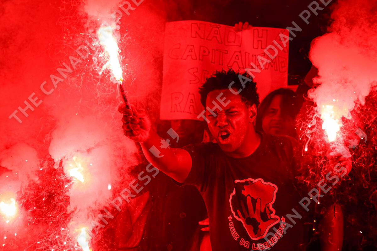 People protest against racism suffered by Brazilian soccer star Vinicius Junior who plays for Spain's Real Madrid, outside the Spanish Consulate in Sao Paulo, Brazil, Tuesday, May 23, 2023. Vinicius, who is Black, has been subjected to repeated racist taunts since he arrived in Spain five years ago. (AP Photo/Tuane Fernandes)