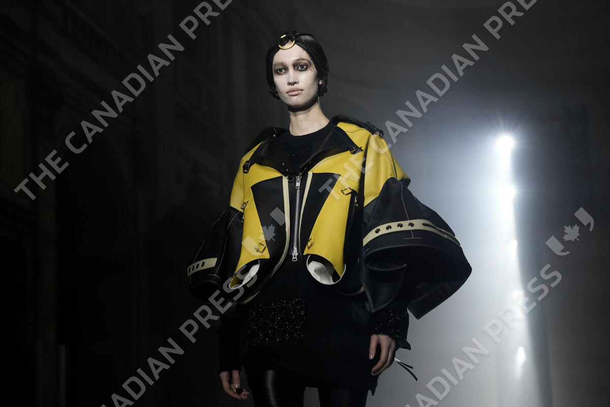 A model wears a creation as part of the Junya Watanabe Fall/Winter 2023-2024 ready-to-wear collection presented Saturday, March 4, 2023 in Paris. (Scott Garfitt/Invision/AP)