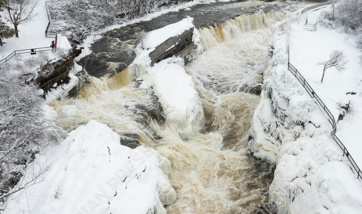 In this photo taken using a drone, a woman takes in the view from a lookout at the Prince of Wales Falls, Tuesday Jan.17, 2023 in Ottawa. THE CANADIAN PRESS/Adrian Wyld
