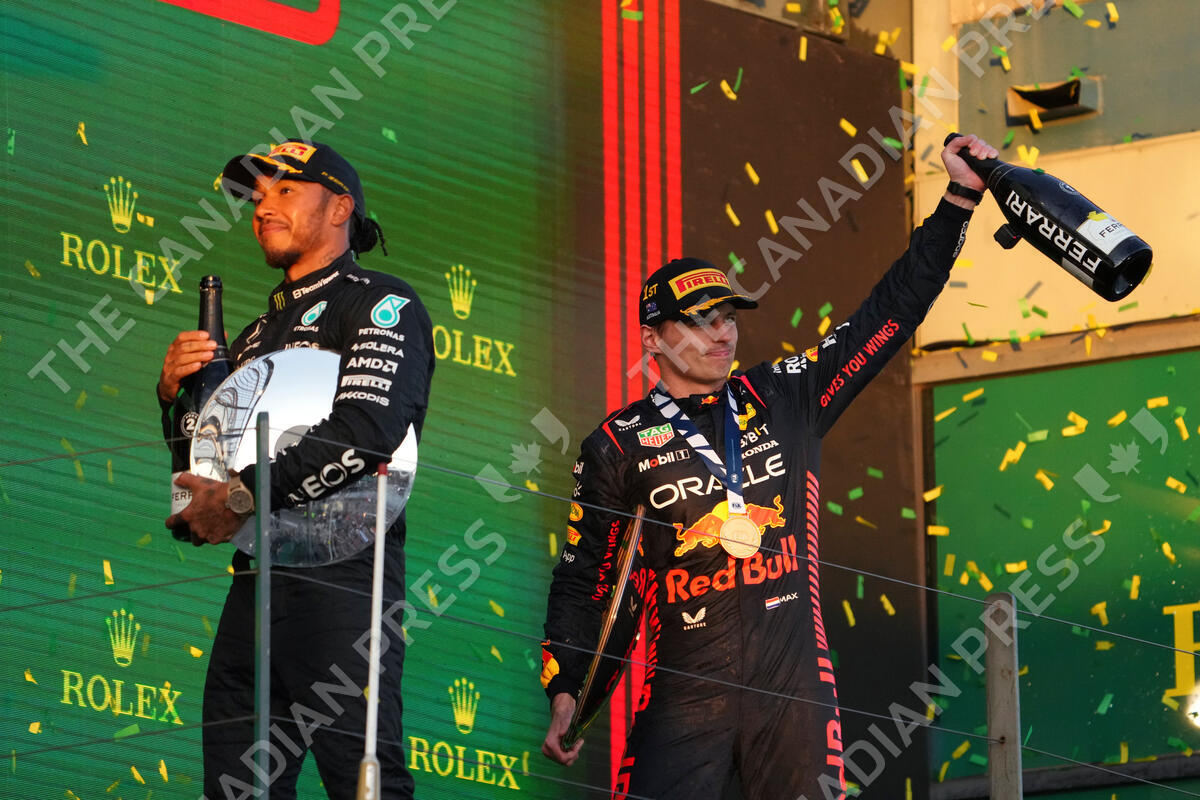Red Bull driver Max Verstappen of Netherlands, right, and Mercedes driver Lewis Hamilton of Britain celebrate on the podium after the Australian Formula One Grand Prix at Albert Park in Melbourne, Sunday, April 2, 2023. Verstappen won the race and Hamilton took 2nd. (AP Photo/Scott Barbour)