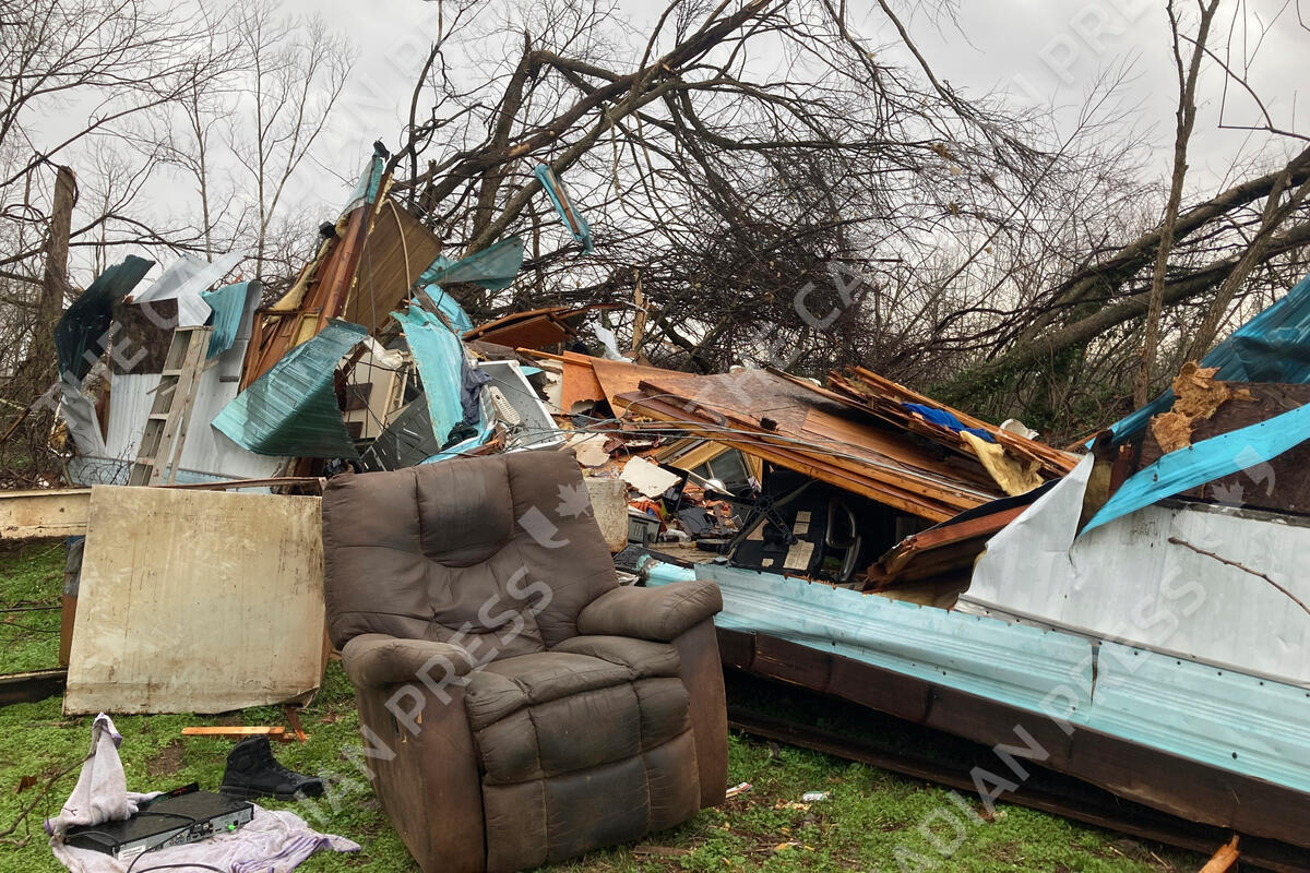 The remains of a mobile home that was torn apart by a tornado lie on the ground in Glen Allen, Mo., on Wednesday, April 5, 2023. Five people who were either in the mobile home or in a camper parked next to it died in the tornado, the Missouri State Highway Patrol said Thursday. (AP Photo/Jim Salter)