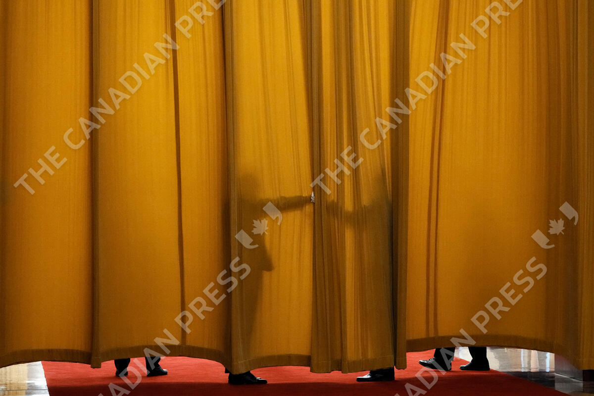Guards keep a curtain closed prior to a meeting between France's President Emmanuel Macron and Chinese Premier Li Qiang at the Great Hall of the People, in Beijing, China, Thursday, April 6, 2023. (AP Photo/Thibault Camus, Pool)