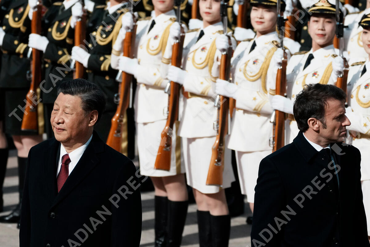 FILE - Chinese President Xi Jinping, left, and France's President Emmanuel Macron review troops during a welcome ceremony at the Great Hall of the People in Beijing, China, April 6, 2023. Russian threats to nuke Ukraine. China’s belligerent military moves around rival Taiwan, its growing ties with Moscow and its growing assertiveness throughout Asia. North Korea’s unprecedented run of weapons testing and development. The top diplomats from seven of the world’s most powerful countries will have plenty to discuss when they gather in the hot spring resort town of Karuizawa starting Sunday, April 16, 2023, for the Group of Seven foreign ministers’ summit. (AP Photo/Thibault Camus)
