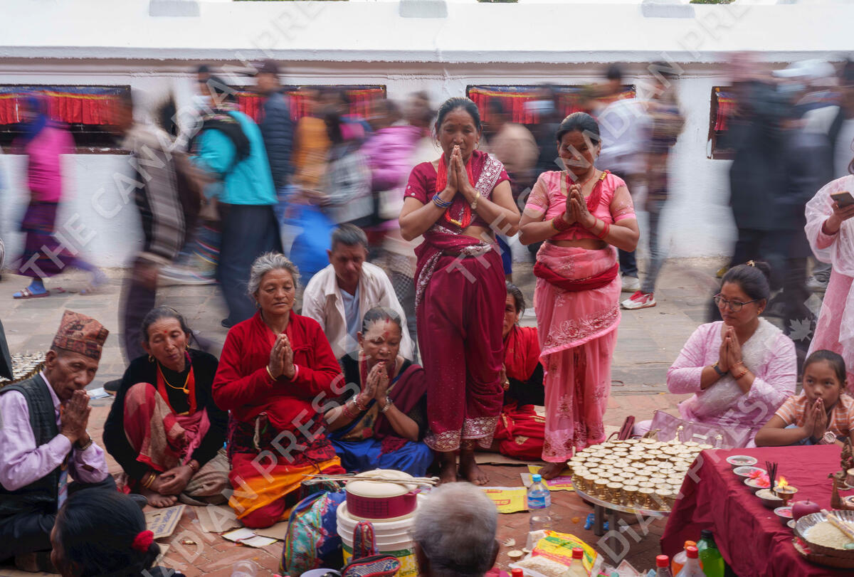 Tamang community people perform rituals during the Temal festival at Boudhanath Stupa in Kathmandu, Nepal, Wednesday, April 5, 2023. During this festival people from the Tamang community gather in nearby monasteries or stupas light butter lamp performs rituals to pay homage to their loved ones who have passed away. (AP Photo/Niranjan Shrestha)