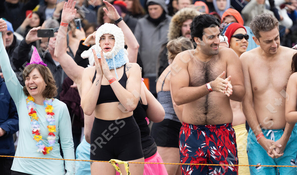 People participate in the annual New Years Day Polar Bear Dip in Oakville, Ont., on Sunday, January 1, 2023. Participants plunge into the frigid waters of Lake Ontario each year to raise money for charity. THE CANADIAN PRESS/Arlyn McAdorey