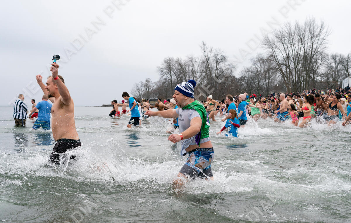 People participate in the annual New Years Day Polar Bear Dip in Oakville, Ont., on Sunday, January 1, 2023. Participants plunge into the frigid waters of Lake Ontario each year to raise money for charity. THE CANADIAN PRESS/Arlyn McAdorey