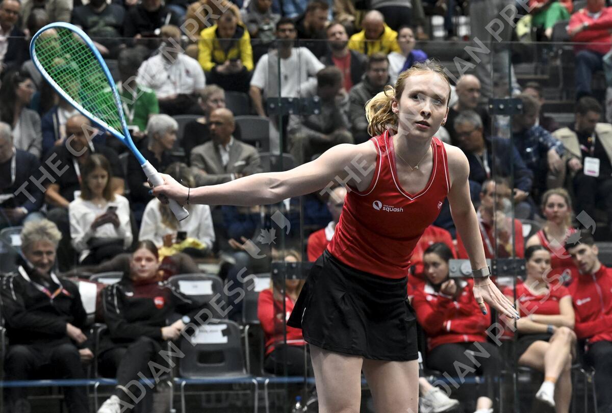 Lucy Turmel of England during women's final match of ESF European Team Division 1 & 2 Squash Championships in Helsinki, Finland, on April 29, 2023. LEHTIKUVA / MARKKU ULANDER - FINLAND OUT. NO THIRD PARTY SALES.