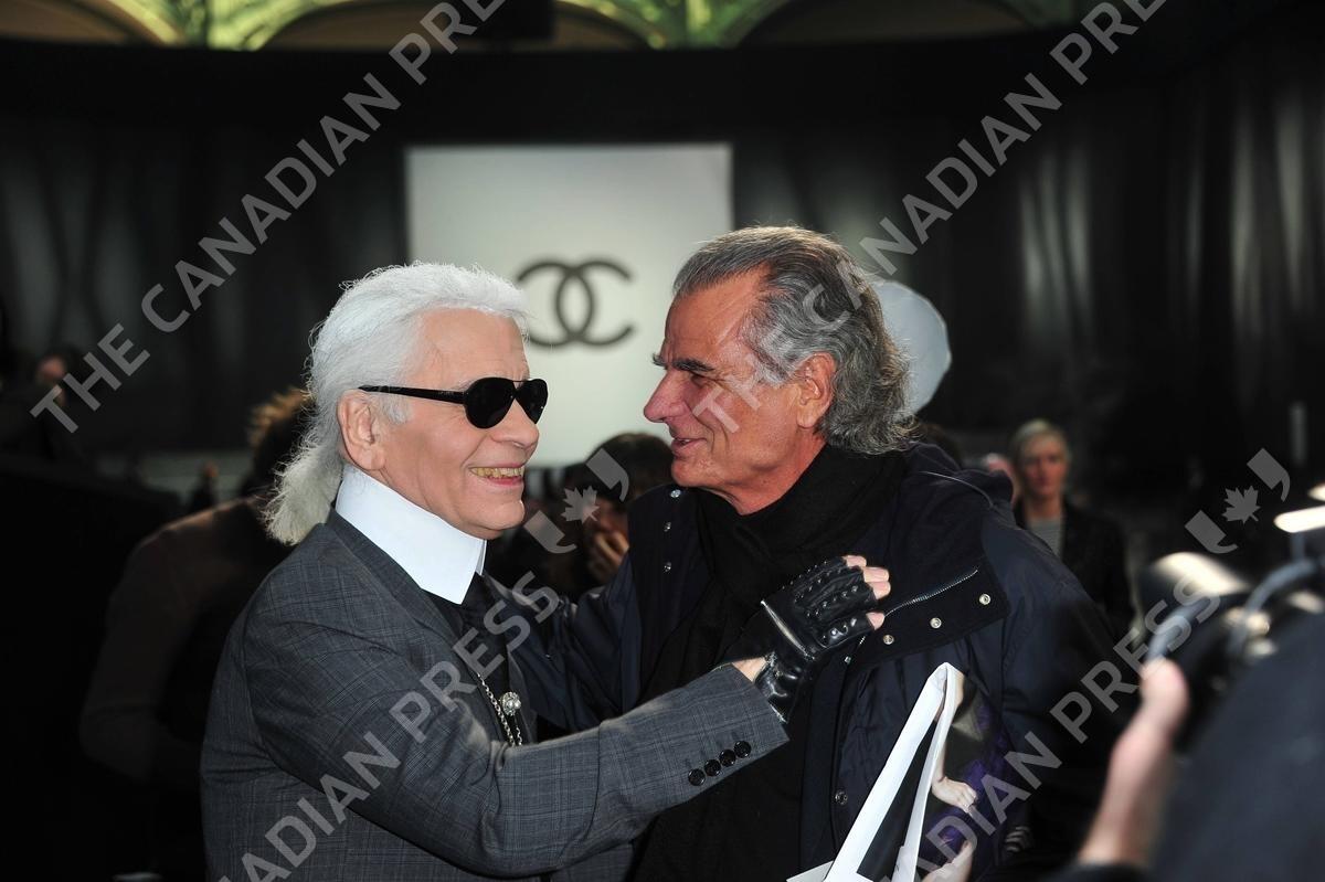 Karl Lagerfeld and Patrick de Marchelier posing at the Chanel Ready-To-Wear Fall-Winter 2011-2012 fashion show designed by Karl Lagerfeld at the Grand Palais in Paris, France on March 8, 2011, as part of the Paris Fashion Week. Photo by Frederic Nebinger/ABACAPRESS.COM