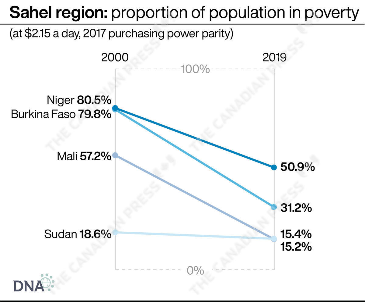 The number of people living in poverty has fallen since 2000, but Niger, Burkina Faso, Mali and Sudan are still among the poorest countries in the world. (Graphic by PA Media for DNA)