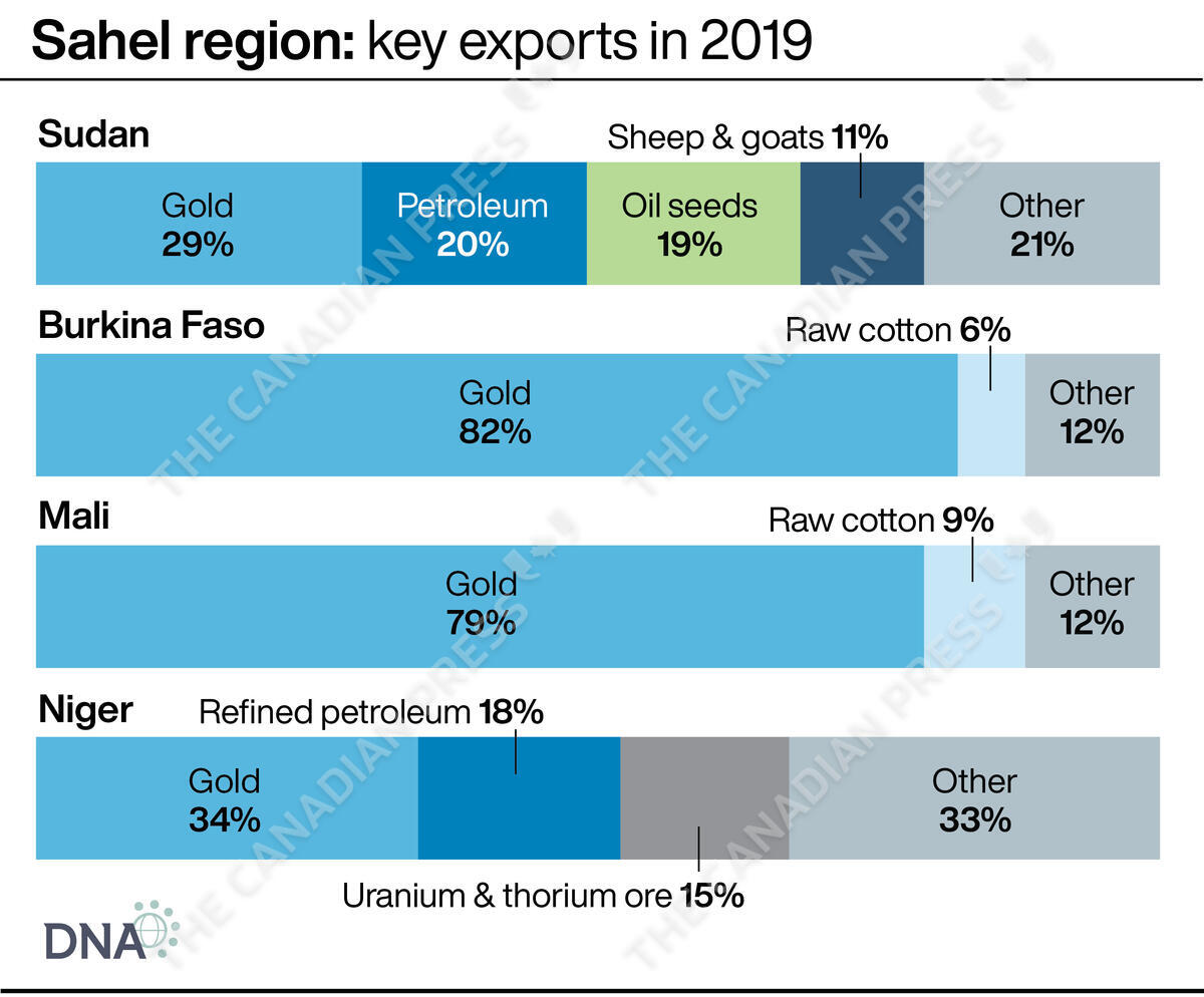 Gold, petroleum and other raw materials: Only a few commodity groups dominated exports from Burkina Faso, Mali, Niger and Sudan in 2019. (Graphic by PA Media for DNA)