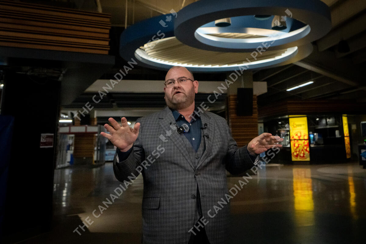 B.C. Place General Manager, Chris May speaks on an updated fan and food court area underneath the stands during a FIFA World Cup 2026 update in Vancouver, Tuesday, April. 30, 2024. THE CANADIAN PRESS/Ethan Cairns