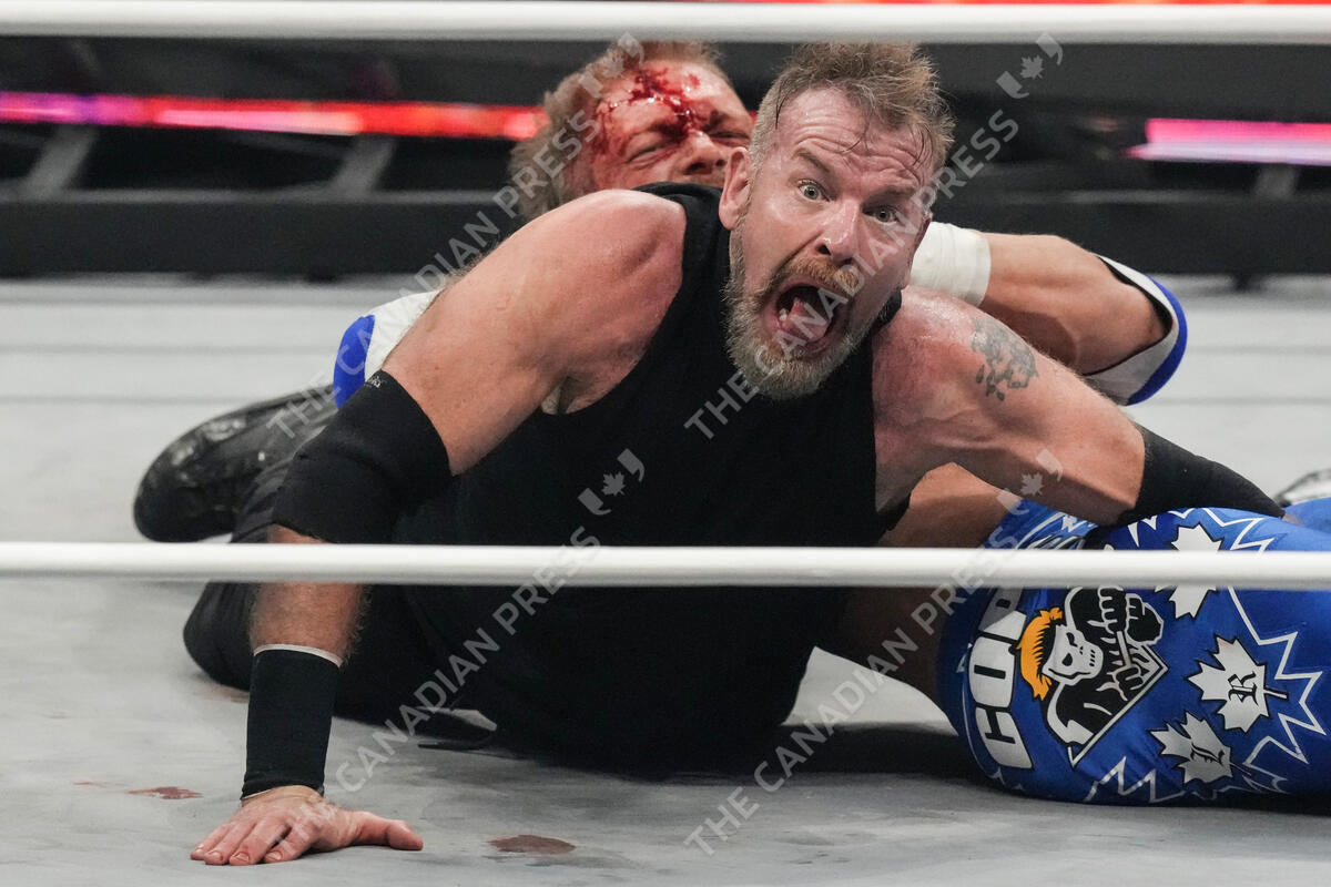 Christian Cage from Orangeville, Ont., reacts during his bout with fellow Canadian wrestler, and former partner, Adam Copeland, during All Elite Wrestling's Dynamite/Rampage card in Toronto, on Wednesday, March 20, 2024. THE CANADIAN PRESS/Chris Young