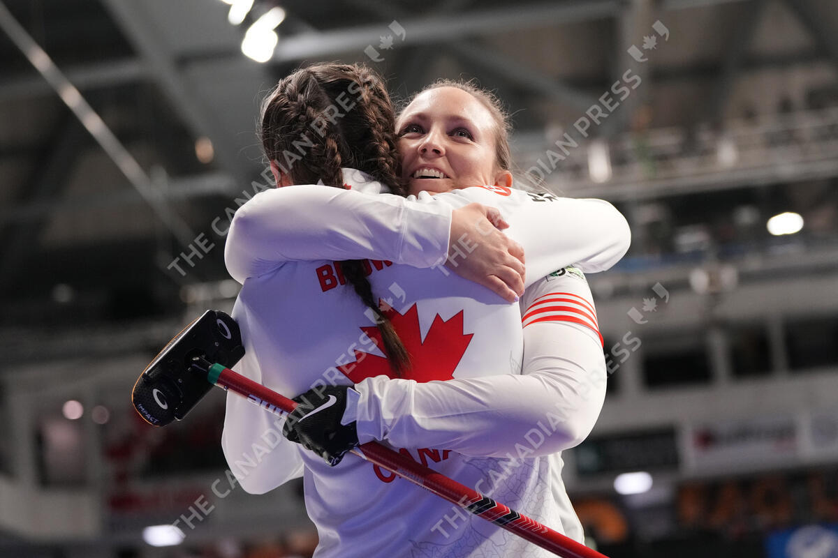 Canada skip Rachel Homan, right, celebrates with teammate Rachel Brown following Homan's game-winning final shot during World Women's Curling Championship action against Turkey in Sydney, N.S. on Wednesday, March 20, 2024. THE CANADIAN PRESS/Darren Calabrese