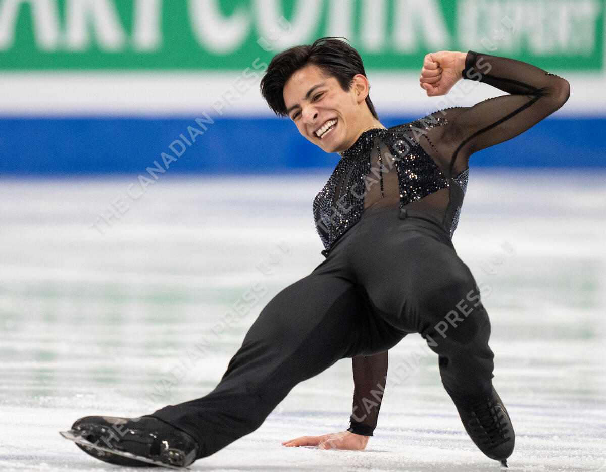 Donovan Carrillo of Mexico reacts following his short program performance in the men's competition at the 2024 ISU World Figure Skating Championships in Montreal, Thursday, March 21, 2024. THE CANADIAN PRESS/Christinne Muschi