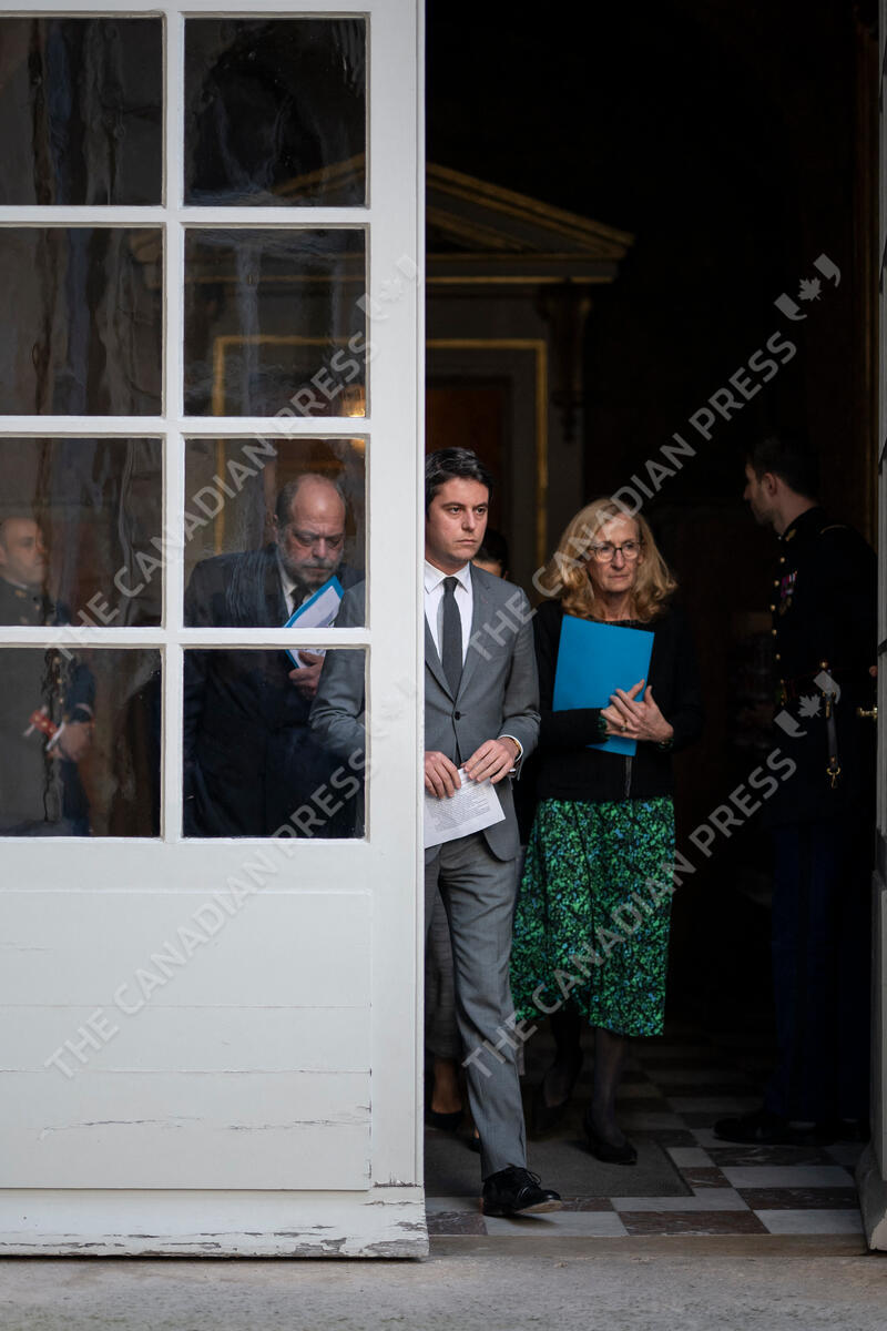 France's Prime Minister Gabriel Attal, flanked by France's Minister for Justice Eric Dupond-Moretti , France's Deputy Minister for Children, Youth and French Secretary of State for Cities Sabrina Agresti-Roubache and France's Minister for Education and Youth Nicole Belloubet , addresses media following a meeting focused on school safety at Hotel Matignon in Paris on March 21, 2024.
