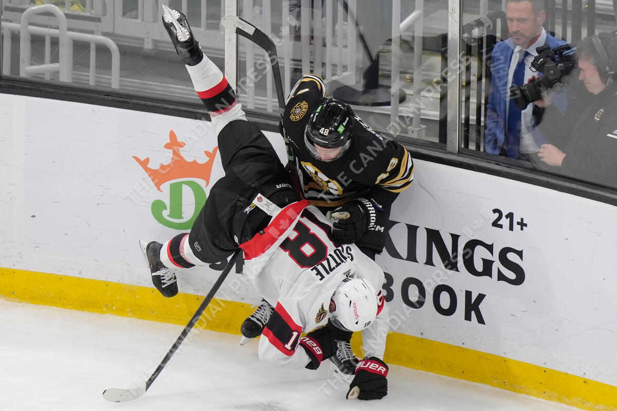 Ottawa Senators center Tim Stutzle (18) and Boston Bruins defenseman Matt Grzelcyk (48) slam into the boards after colliding in the second period of an NHL hockey game, Tuesday, March 19, 2024, in Boston. (AP Photo/Steven Senne)