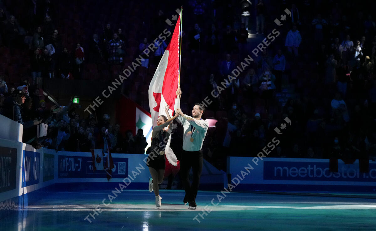 Deanna Stellato-Dudek and Maxime Deschamps of Canada celebrate their gold medal following the victory ceremony in the pairs competition during the 2024 ISU World Figure Skating Championships in Montreal, Thursday, March 21, 2024. THE CANADIAN PRESS/Christinne Muschi