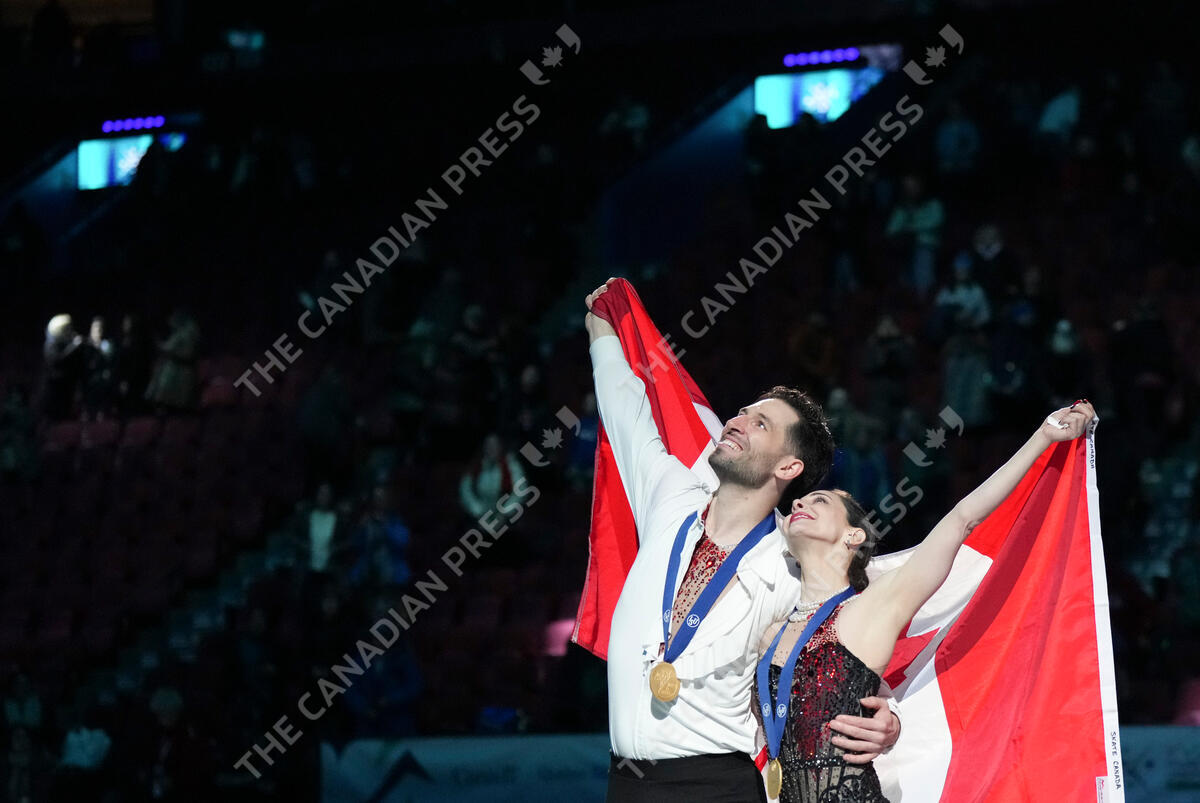 Deanna Stellato-Dudek and Maxime Deschamps of Canada pose with their gold medals following the victory ceremony in the pairs competition during the 2024 ISU World Figure Skating Championships in Montreal, Thursday, March 21, 2024.THE CANADIAN PRESS/Christinne Muschi