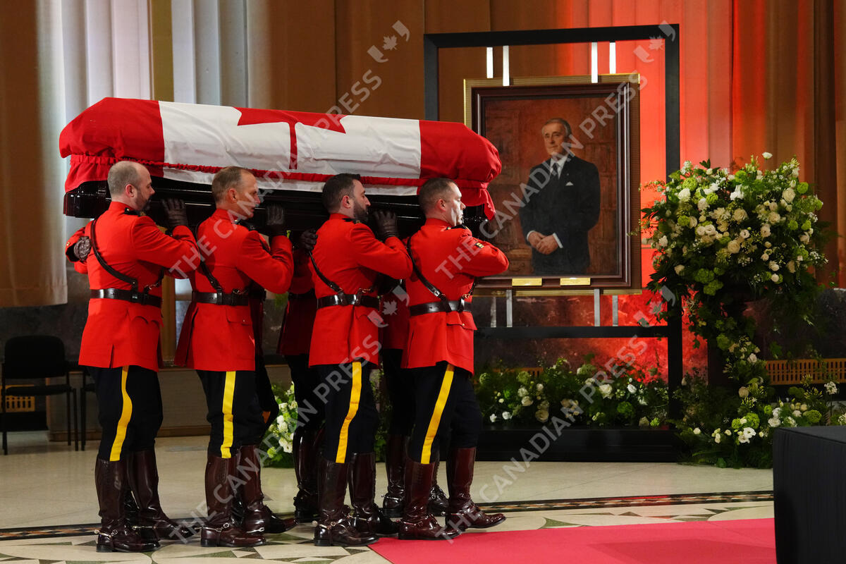 A honour guard carries the casket of former prime minister Brian Mulroney into the Sir John A. Macdonald building opposite Parliament Hill in Ottawa on Tuesday, March 19, 2024. THE CANADIAN PRESS/Sean Kilpatrick