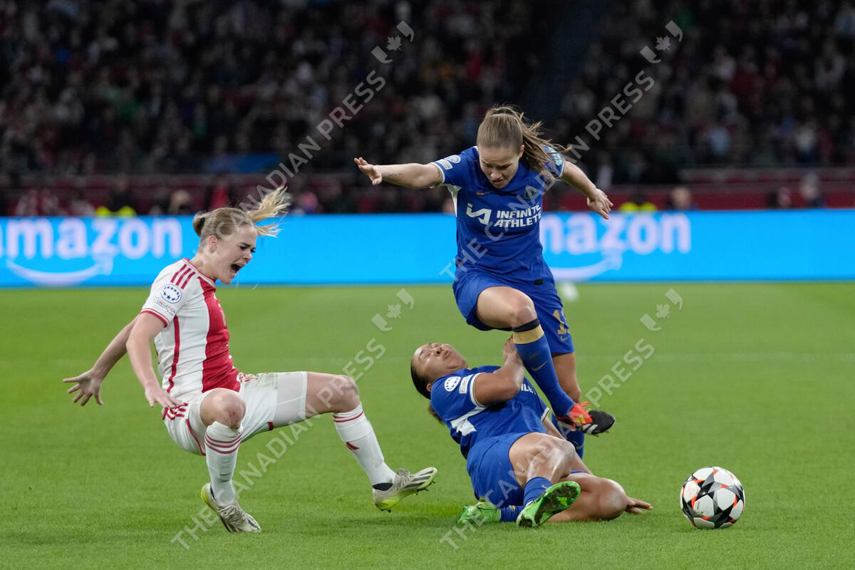 Ajax's Milicia Keijzer, left, Chelsea's Lauren James, on the ground, and Chelsea's Guro Reiten, challenge for the ball during the Women's Champions League quarterfinal soccer match between Ajax and Chelsea at the Johan Cruyff ArenA, in Amsterdam, Netherlands, Tuesday, March 19, 2024. (AP Photo/Peter Dejong)