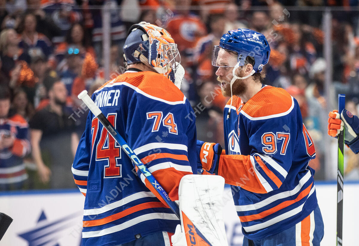 Edmonton Oilers goalie Stuart Skinner (74) and Connor McDavid (97) celebrate after defeating the Dallas Stars in game 4 of the Western Conference finals of the NHL Stanley Cup playoffs in Edmonton on Wednesday May 29, 2024.THE CANADIAN PRESS/Jason Franson