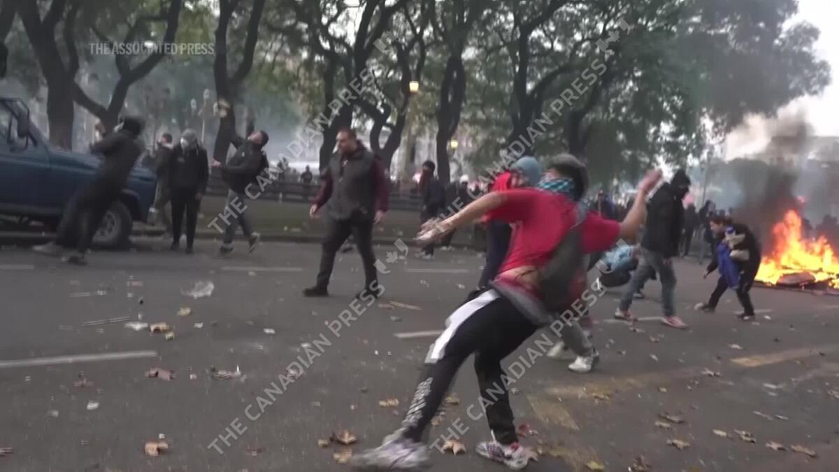 Argentine riot police fired water cannons and tear gas to disperse protesters who threw stones and Molotov cocktails outside Congress on Wednesday. The protests come as Argentina's Senate began voting on a state overhaul and tax bills proposed by President Javier Milei in the most serious test to date of the libertarian leader’s vision of governance and change. (AP Video by Victor R. Caivano)