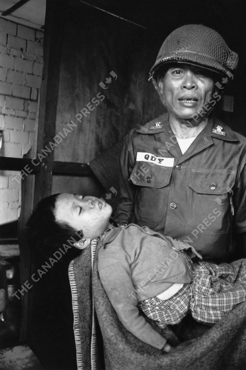 South Vietnamese military officer carries his dead child from his home. The officer?s family was executed by the Viet Cong during the night of Jan. 31, when they overran his home in a military compound in a northern suburb of Saigon. He was out leading his troops in Saigon Street fighting, Feb. 1, 1968. (AP Photo)