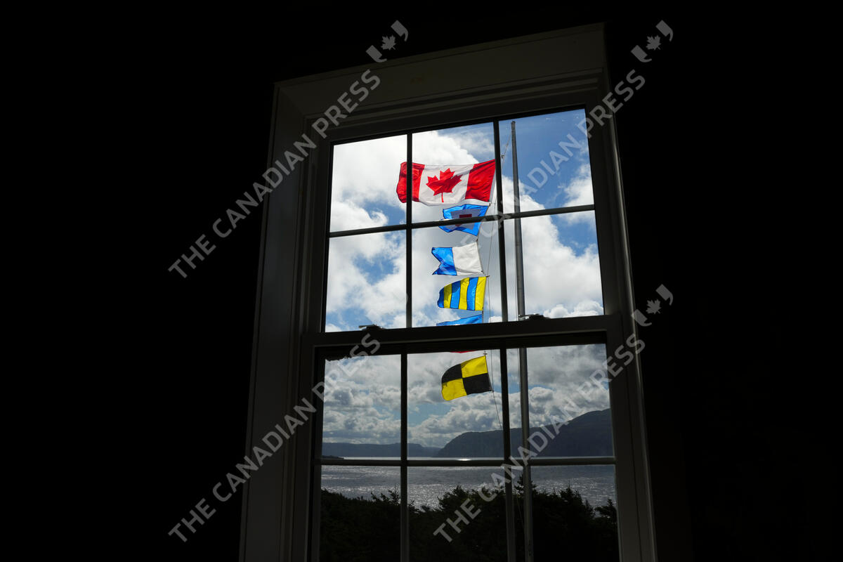 Flags are pictured through a window as they fly in the wind at Lobster Cove Head Lighthouse in Rocky Harbour, Nfld., on Wednesday, Sept. 4, 2024. THE CANADIAN PRESS/Sean Kilpatrick