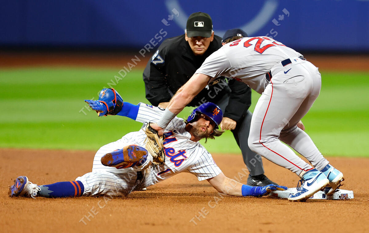 New York Mets' Jeff McNeil (1) is tagged out by Boston Red Sox Romy Gonzalez (23) at second base after trying to advance on a Red Sox fielding error during the seventh inning of a baseball game, Wednesday, Sept. 4, 2024, in New York. (AP Photo/Noah K. Murray)