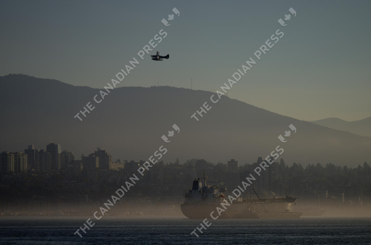 A Harbour Air seaplane takes off past the Seaways Athens oil tanker as a marine layer hangs over Burrard Inlet, in Vancouver, on Wednesday, September 4, 2024. THE CANADIAN PRESS/Darryl Dyck