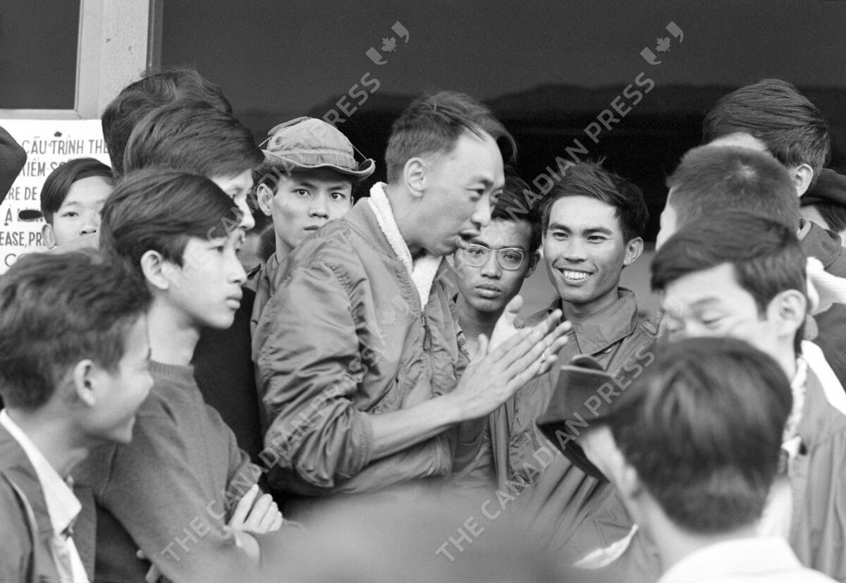 Brig. Gen. Nguyen Ngoc Loan, chief of Vietnam's National Police Force tells stories to college students presently living in the bombed out Cercle Sportif in Hue, Vietnam in March 1968. It was obvious to their reaction to him that he had won them over on his side. (AP Photo/Eddie Adams)
