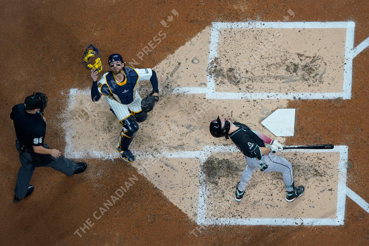Arizona Diamondbacks' Corbin Carroll, right, and Milwaukee Brewers' Eric Haase, middle, look up at a foul ball during the second inning of a baseball game, Saturday, Sept. 21, 2024, in Milwaukee. (AP Photo/Aaron Gash)