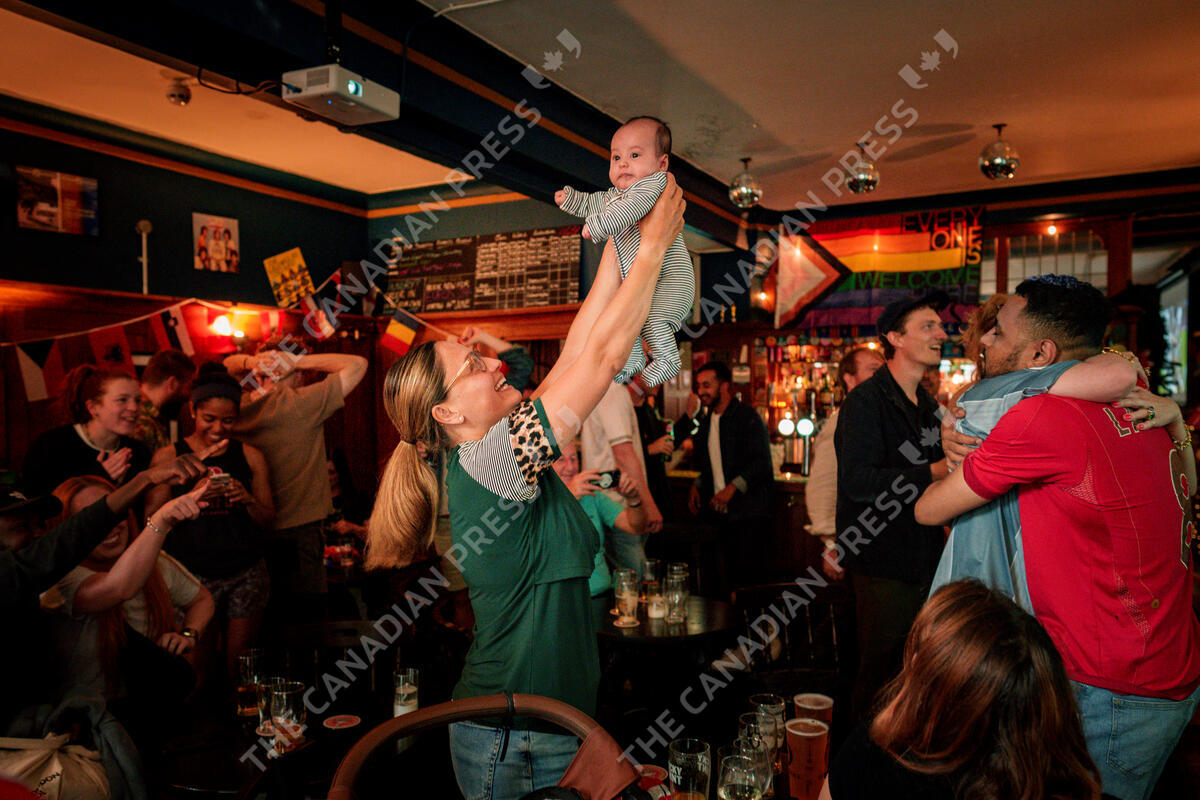 A woman lifts a baby as people celebrate a goal by England's team during the match against Slovakia at the Euro 2024 championship in the Old Justice pub in London, Sunday, June 30, 2024. (AP Photo/Vadim Ghirda)