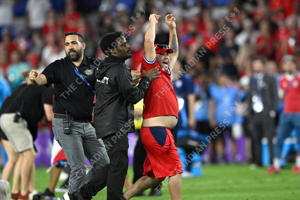 A spectator is removed by security guards after running onto the pitch following a Copa America Group A soccer match between Chile and Canada, Saturday, June 29, 2024, in Orlando, Fla. (AP Photo/Phelan M. Ebenhack)