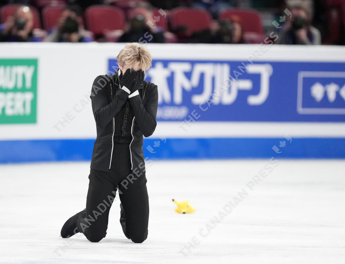 Ilia Malinin of the United States reacts after his free skate in the men's competition at the 2024 ISU World Figure Skating Championships in Montreal, Saturday, March 23, 2024. THE CANADIAN PRESS/Christinne Muschi