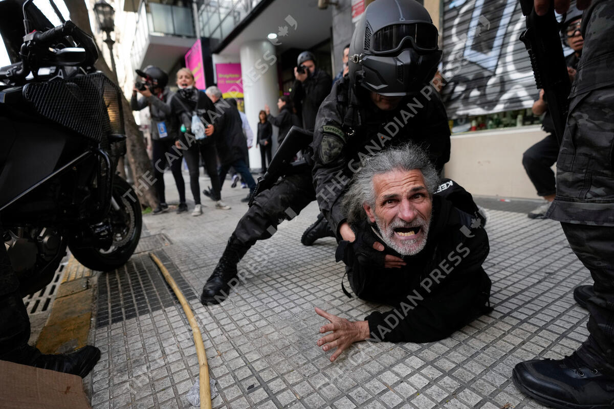 Police detain a protestor during a demonstration against President Javier Milei's veto of a pension raise in front of Congress in Buenos Aires, Argentina, Wednesday, Sept. 11, 2024. (AP Photo/Rodrigo Abd)