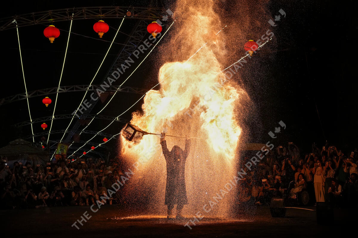 People watch an artist performs a fire kettle show during the Mid-Autumn Festival at a night market in Beijing, Tuesday, Sept. 17, 2024. (AP Photo/Andy Wong)